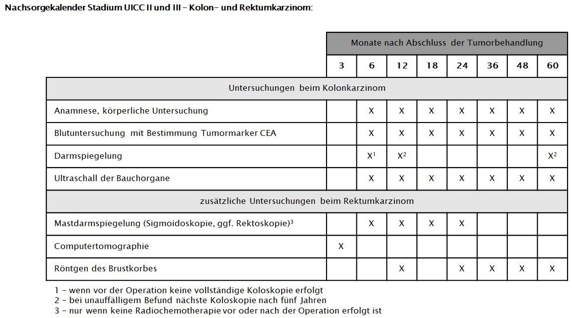 Die für die Tumorstadien II und III empfohlenen Nachsorgeuntersuchungen und –frequenzen können Sie der folgenden Abbildung entnehmen:
